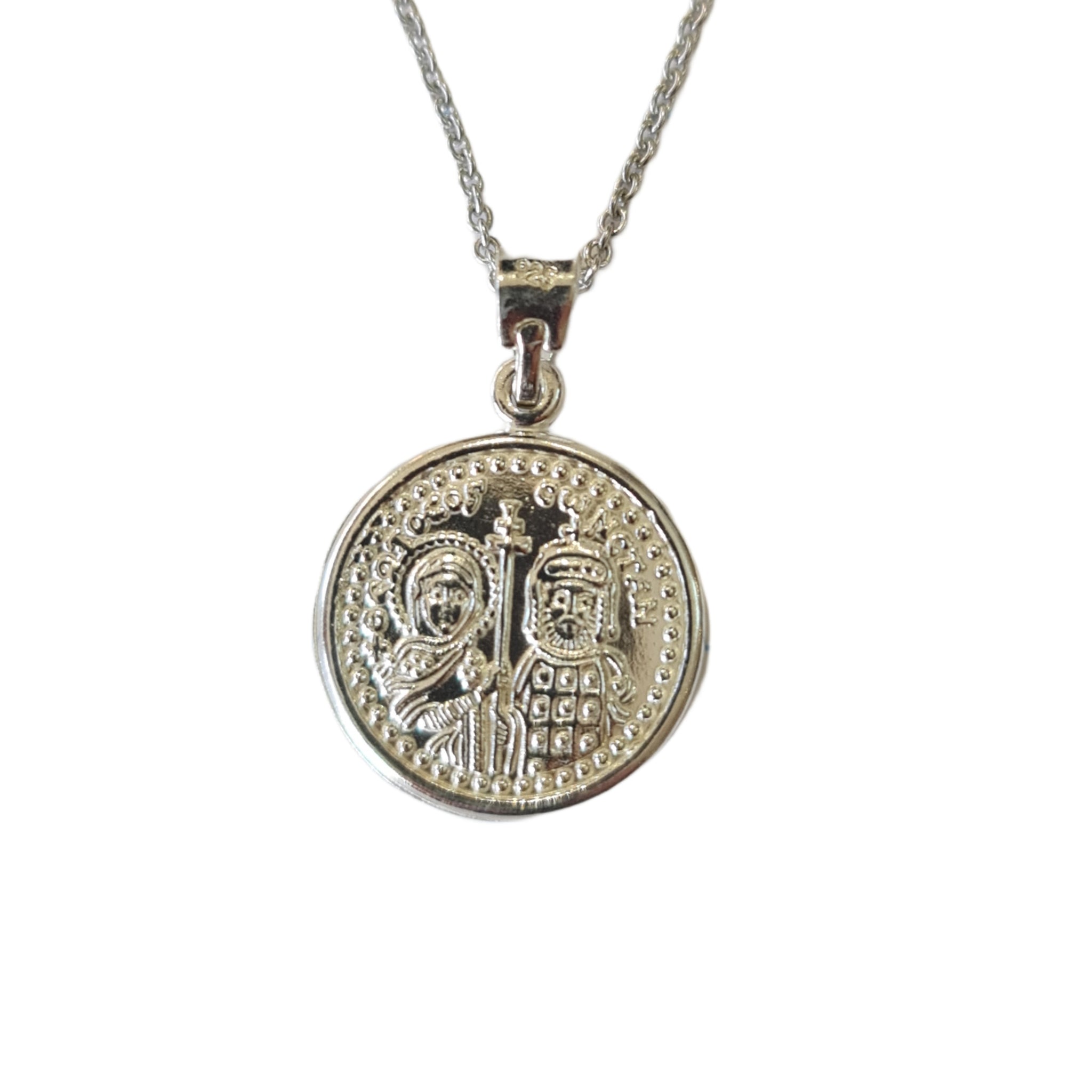 ICXC NIKA Jesus Conquers symbol is shown on one side of the coin medallion and on the other side the Virgin Mary and the Emperor Constantine the Great, both holding a patriarchal cross.