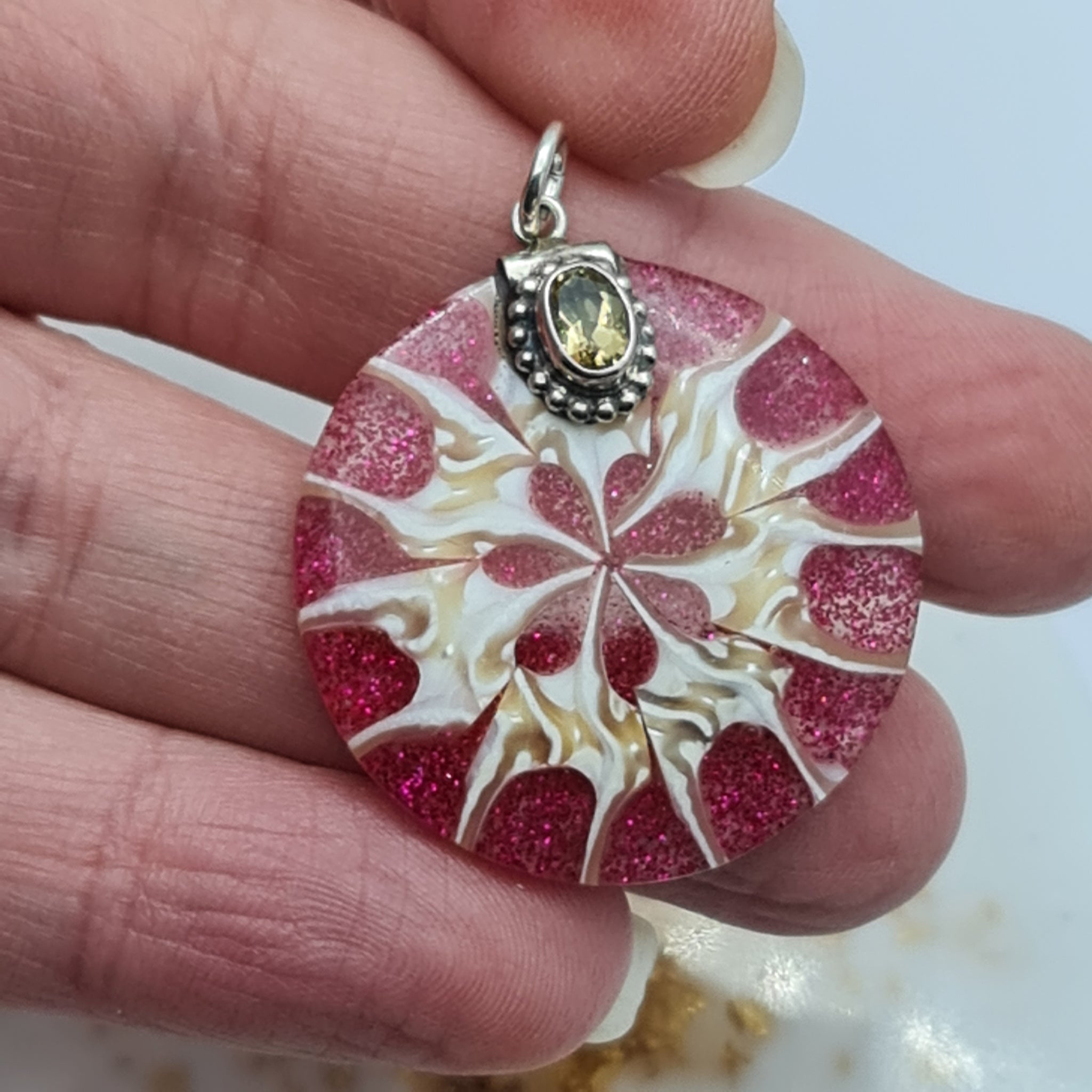 Beautiful shell pattern and pink sparkle resin finish pendant.