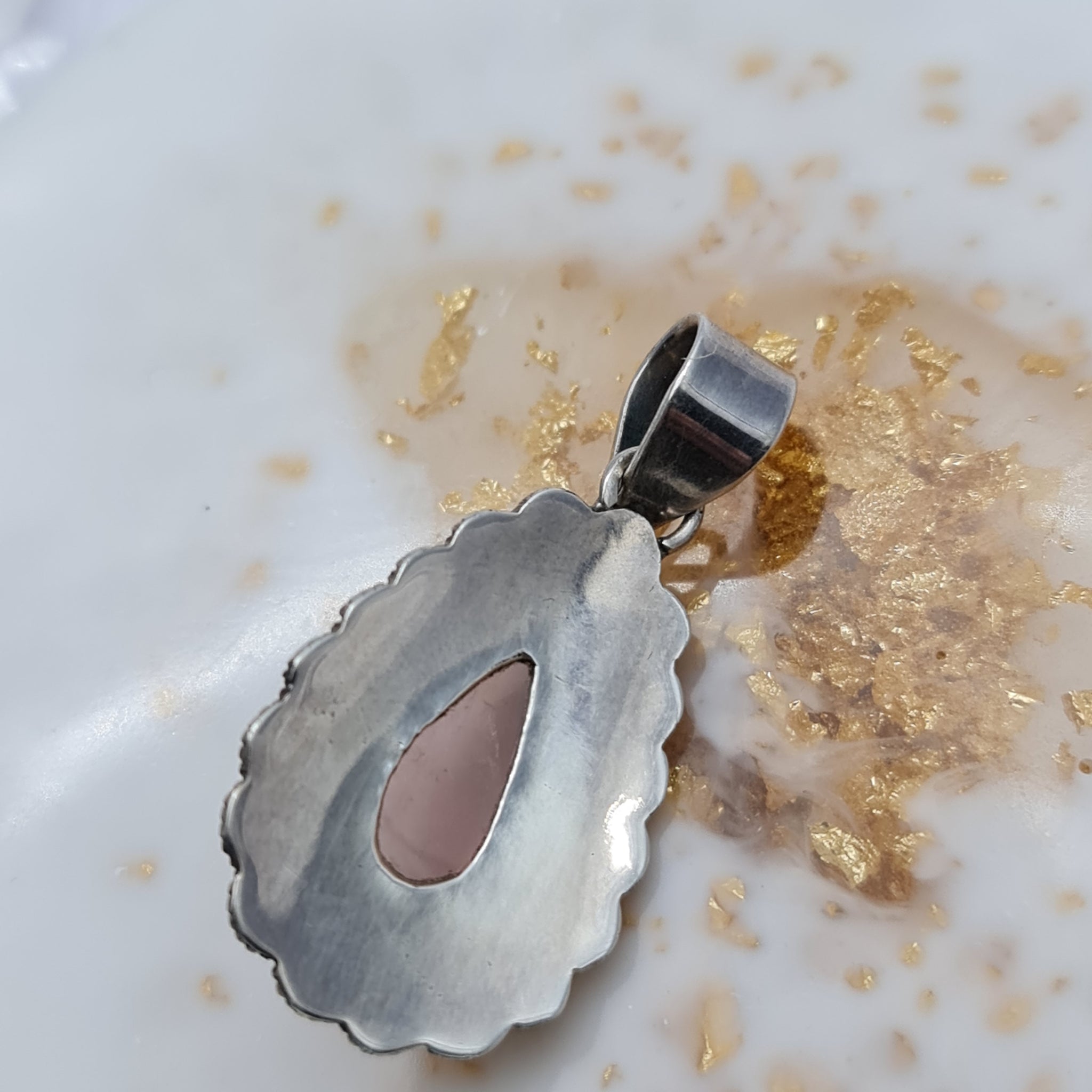 Beautiful mini Turquoise stones surround this gorgeous Rose Quartz tear drop pendant.