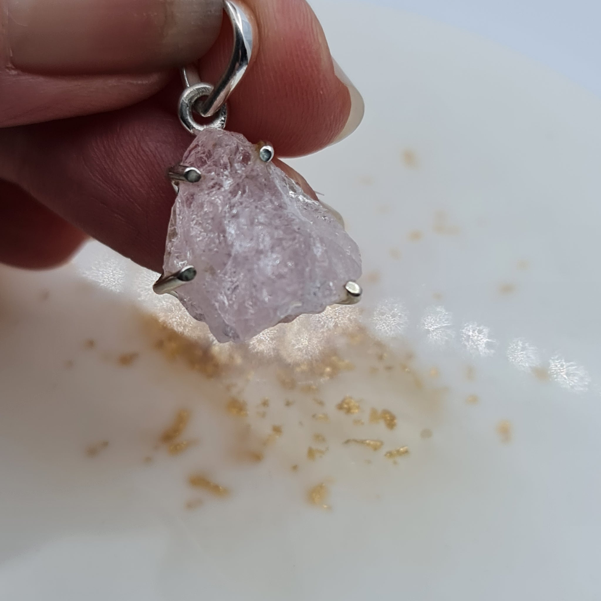 Rose quartz rough cut semiprecious natural stone pendant in 925 sterling silver.