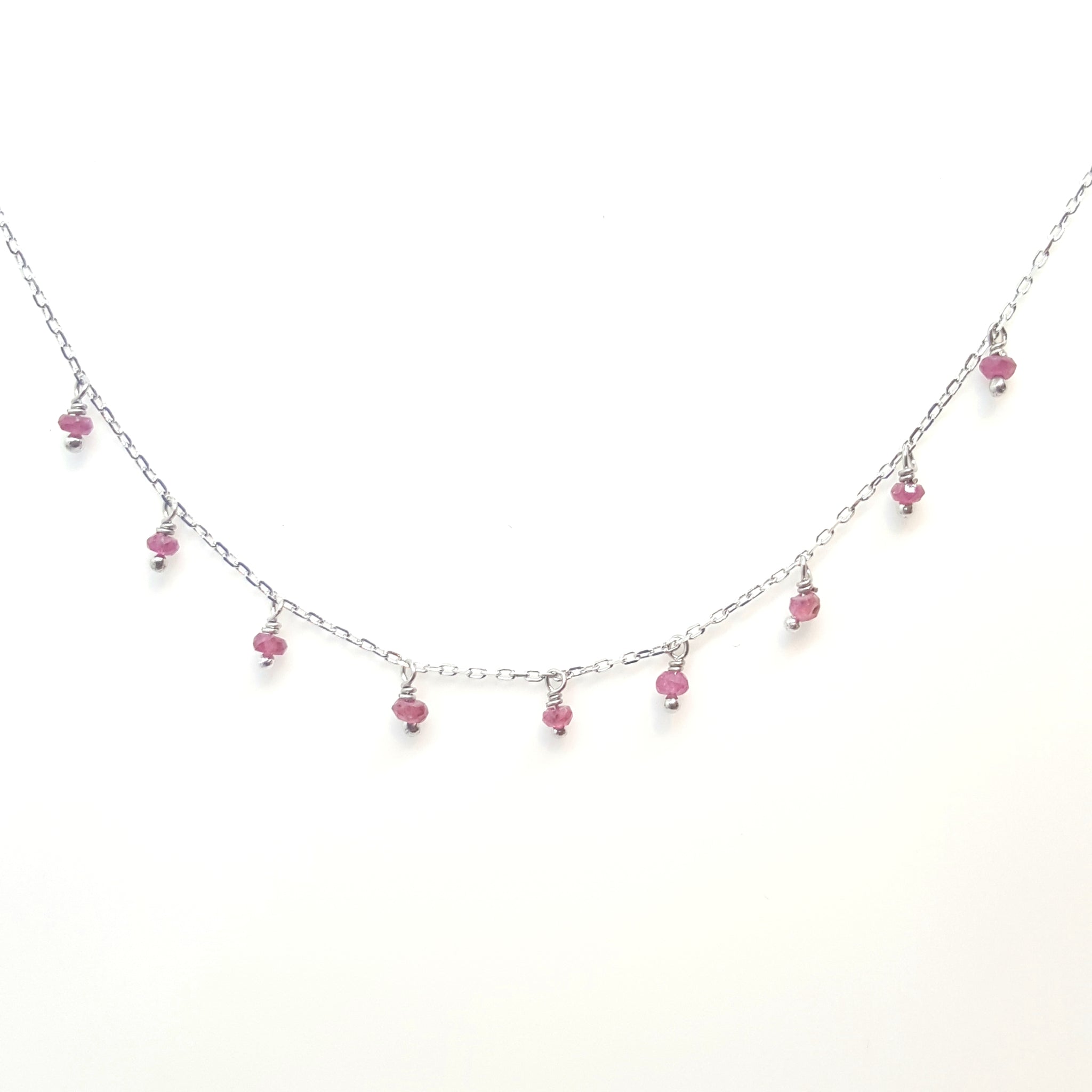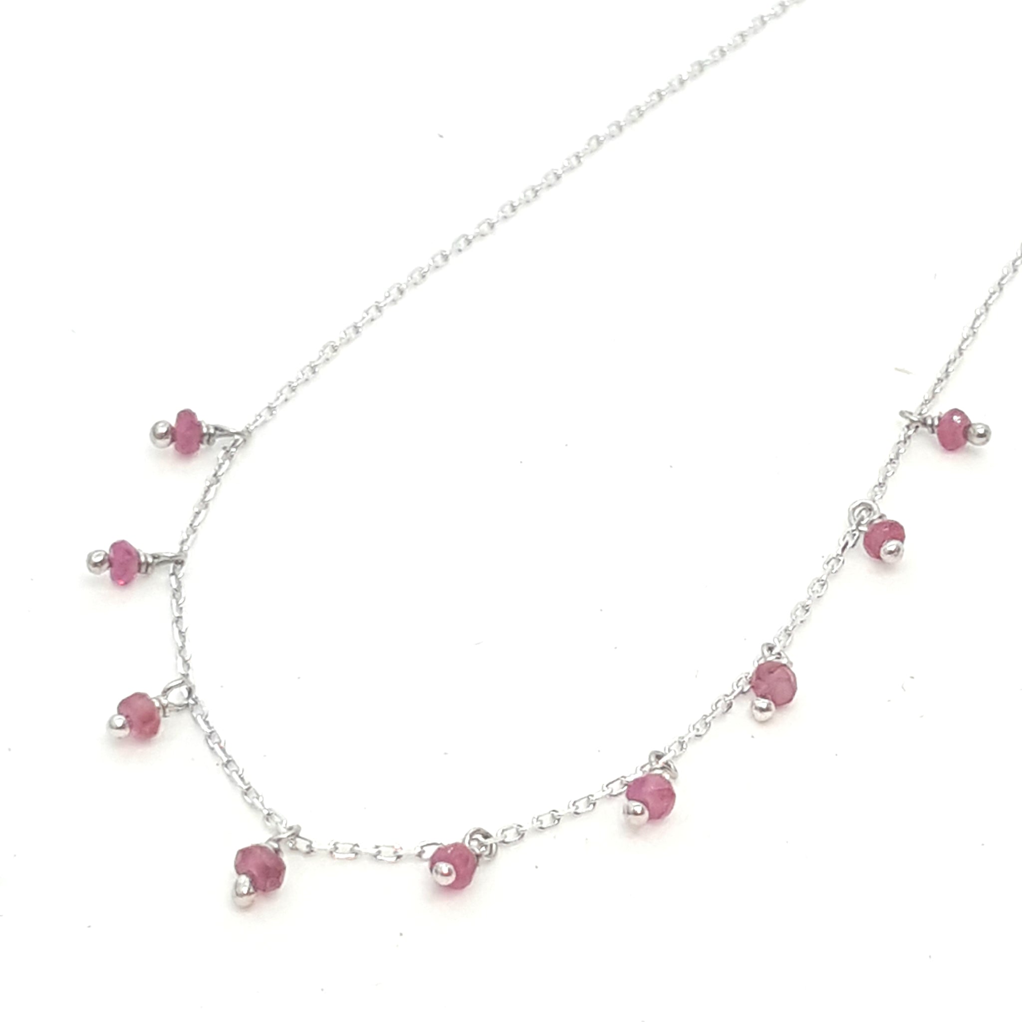 Gorgeous petite necklace scattered with nine natural stone rubies.